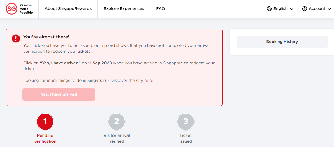 After booking your experience and upon arriving in Singapore, open your email or login to the rewards page, click the “I have arrived” button on the Booking History page to receive your experience ticket. The experience ticket and usage details of the reserved booking will be sent to your email address registered under the program once you have confirmed your arrival in Singapore.