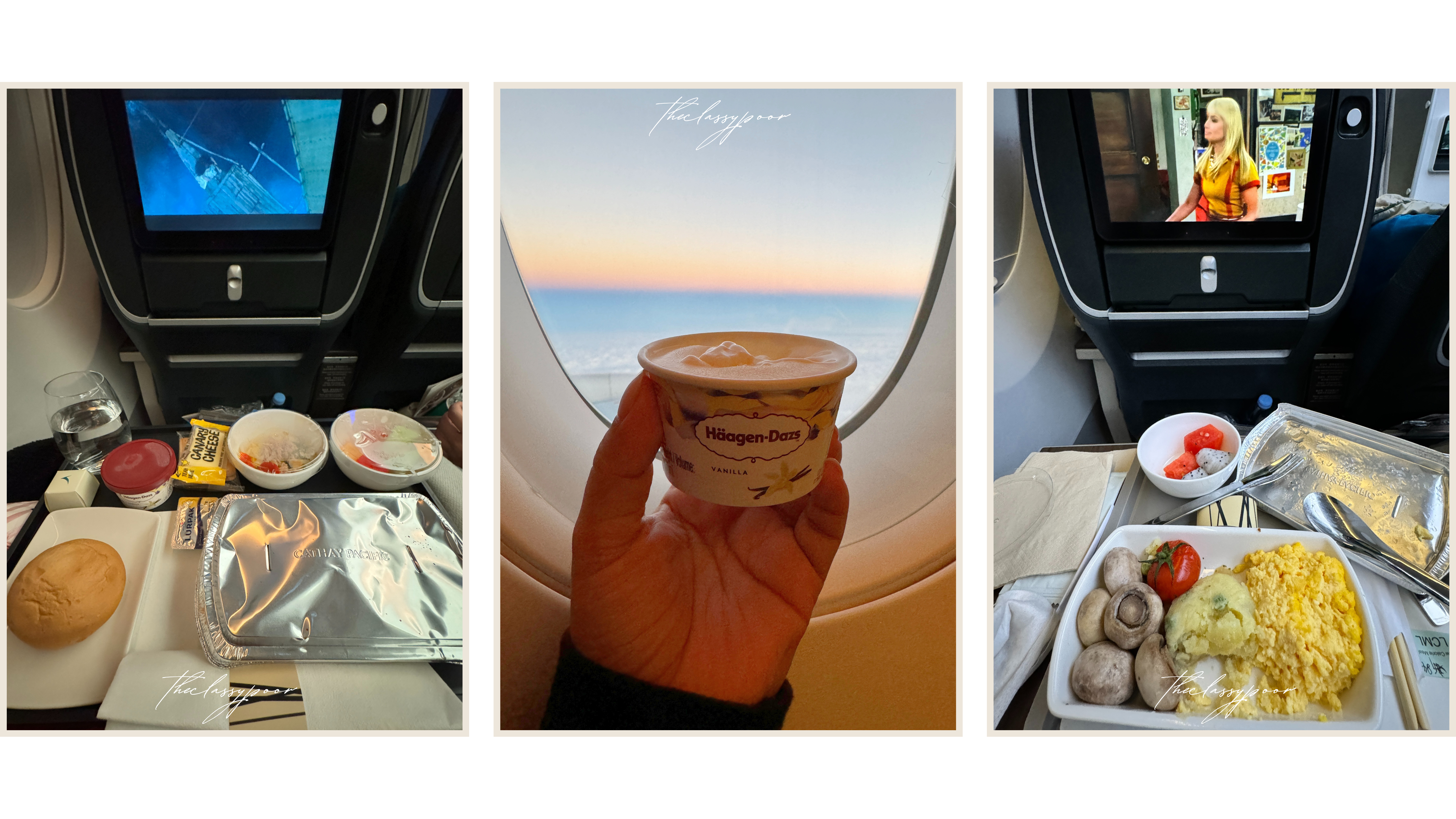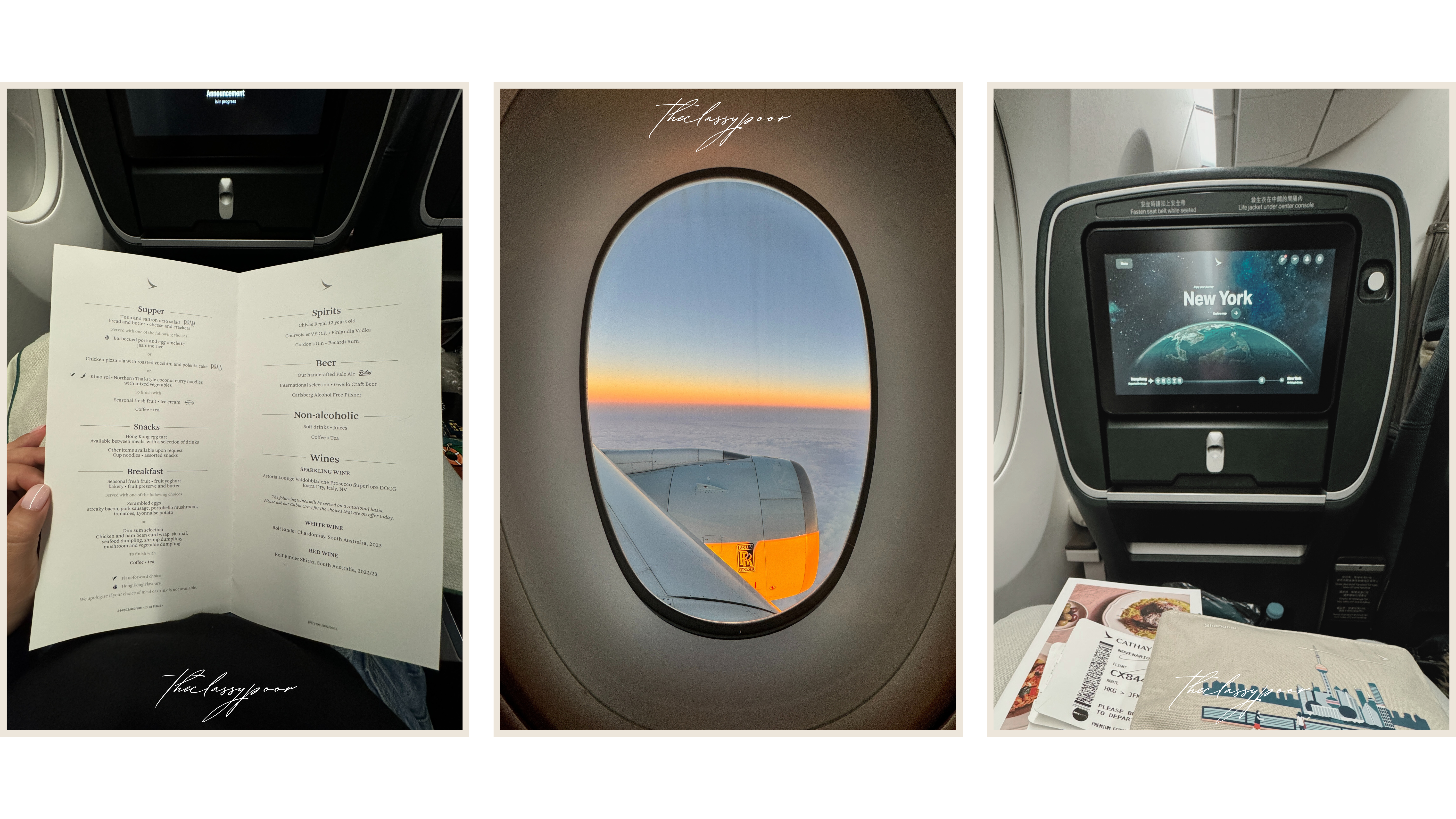 The second meal came closer to New York’s timezone—scrambled eggs, portobello mushroom, tomato, Lyonnaise potato, seasonal fruits, preserves, butter, and ginger ale. It hit the spot. Since I couldn’t connect to the inflight Wi-Fi, my 15.5-hour flight routine turned into a cozy loop of sleeping, watching movies, and eating. Surprisingly, I’d automatically wake up right when the flight attendant was about to serve food—like my stomach was working on airplane instinct.