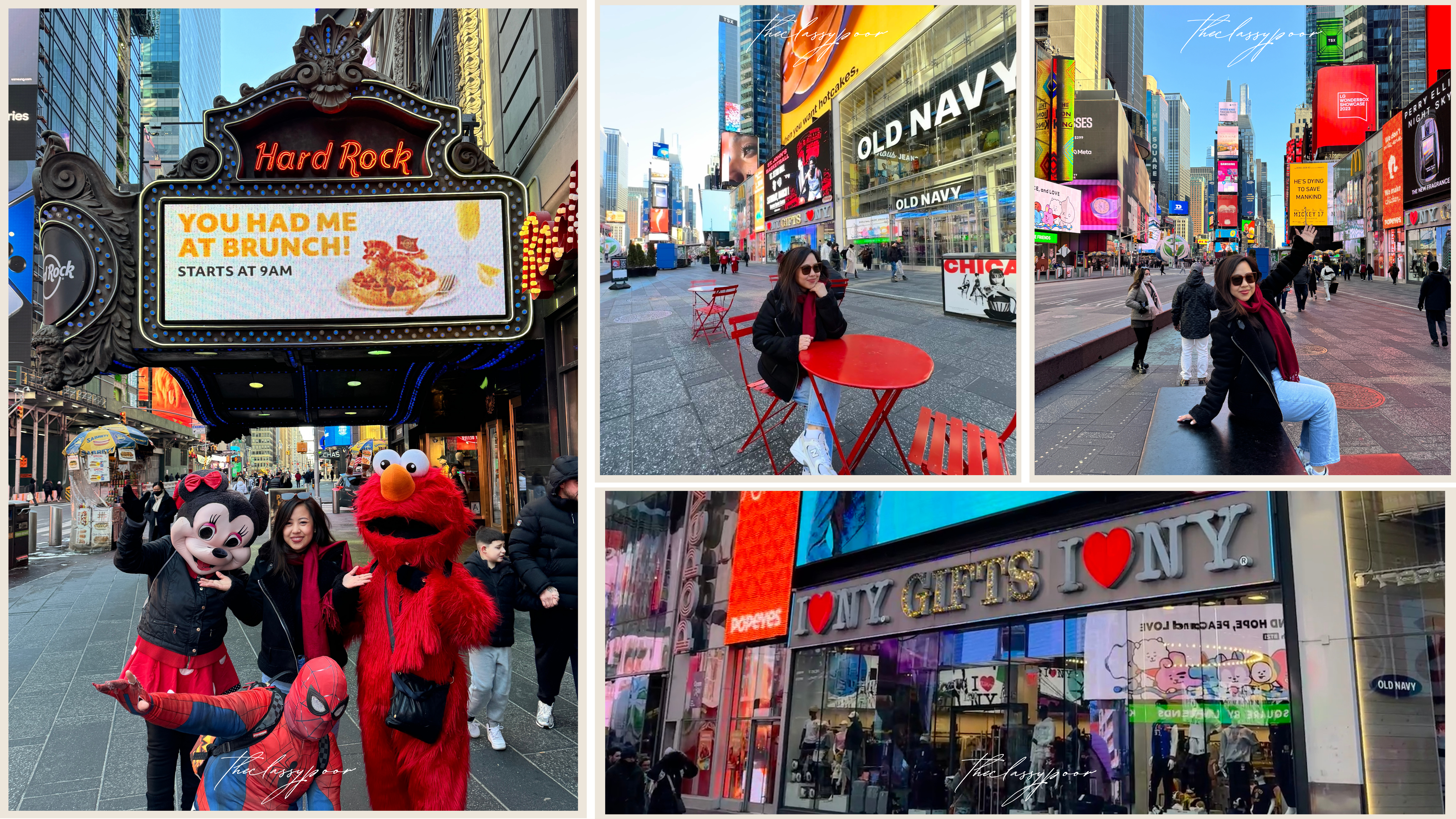 Then came Times Square. It’s just like in the movies—giant buildings, yellow cabs and even NYPD cars (which honestly made me squeal inside). I had a little “Only in New York” moment when I was outside Hard Rock Café, and three people in costume (Spiderman, Mickey Mouse, and Elmo) suddenly appeared in my photos… then demanded $25 for two shots with them. I didn’t even ask them to be in the pic!